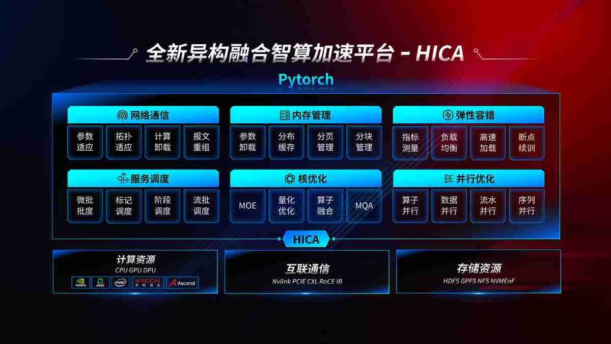 通过自研的服务层、、、中间适配层、、、、以及调度编排算法,,采用数据并行、、模型并行等多种并行方式,,,把并行计算任务进行有效的分解,,,使其分别由相应的软件栈和算力资源来承接。。。。当GPU资源变化,,HICA可以实时动态调度计算子任务并调整模型拓扑和架构,,,以充分聚合各种算力资源。。。。