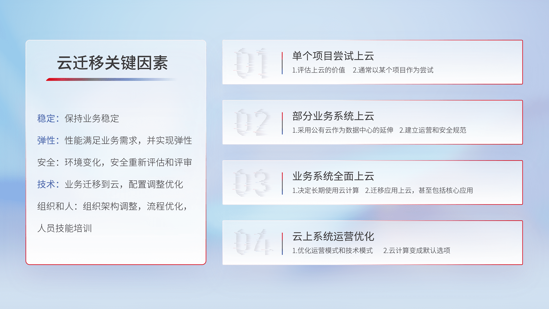 结合实际业务,,,从规划设计、、、云平台选型、、云原生改造、、数据迁移、、集成交付,,,,迁移全过程为客户识别最佳上云路径,,做好风险识别管理,,设计网络架构、、、、身份权限、、、安全审计合规、、、操作审计、、、日志审计、、、监控告警策略、、、、多站点容灾设计等,,,对云上基础设施进行整体规划,,,提升IT治理水平,,,,以满足弹性、、、高可用、、、高性能的需求。。。。